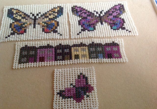 Dianne Clark has been very busy hubbling. She’s made these fabulous butterfly and houses motifs working in basic Hubble Stitch, plus linear and tubular bracelets in 2-drop Hubble. Her next project is to make a scarf in size 15s. I love how she’s embraced the stitch and is exploiting it to the max!